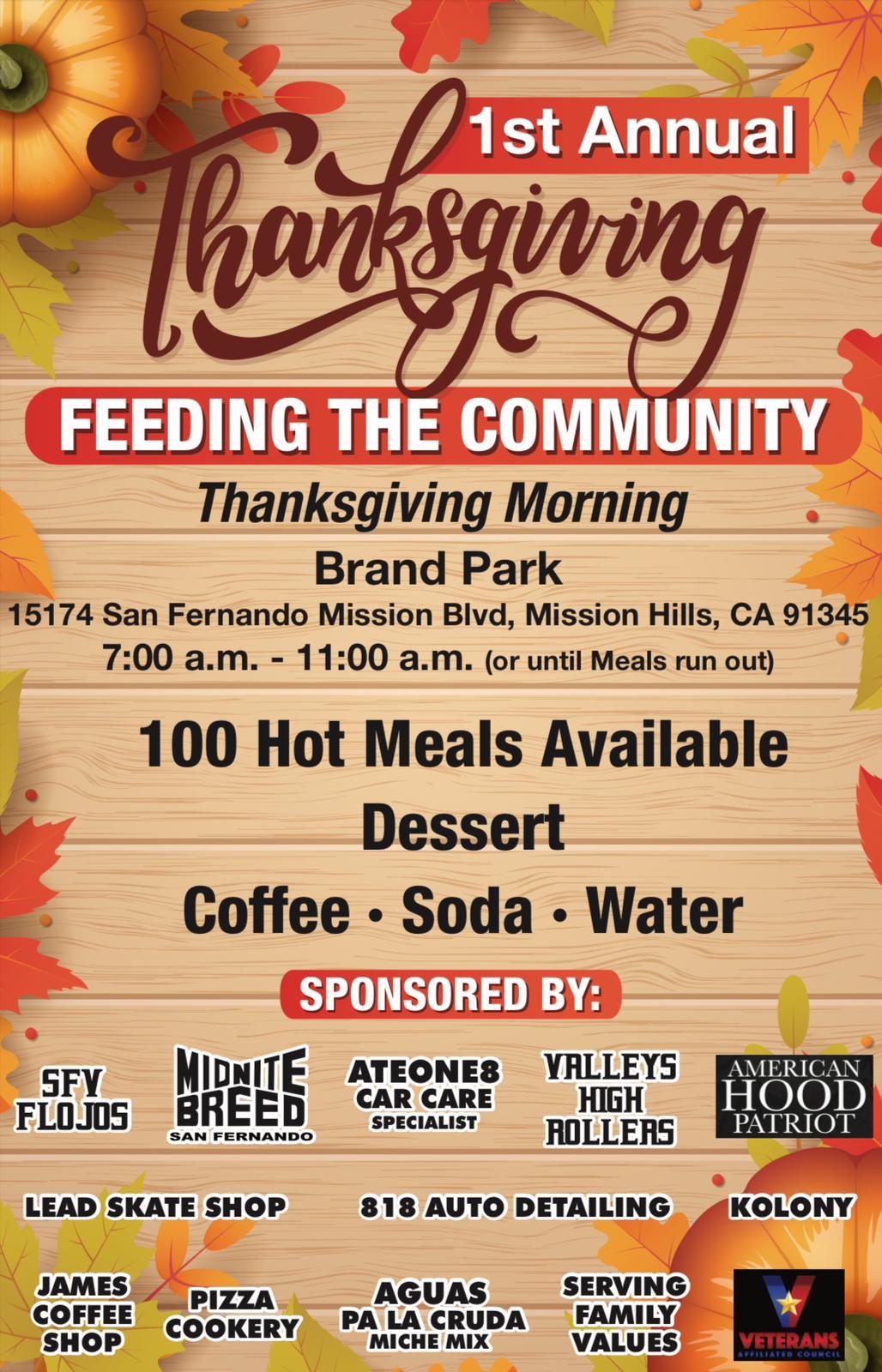 This Thanksgiving morning, come to Brand Park for a special community event! We’re offering 100 free hot meals, delicious desserts, and refreshing beverages from 7 AM to 11 AM. Let’s gather, give back, and make a positive impact together. Don’t miss this chance to connect with your community and enjoy the holiday spirit